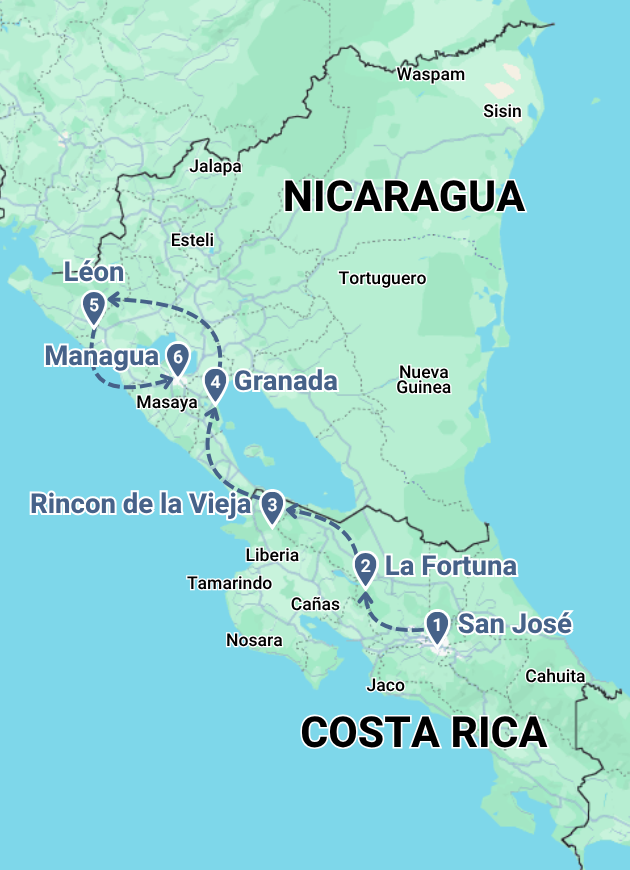 • Cities: San Jose, La Fortuna, Rincón de la Vieja, Granada, León, Managua